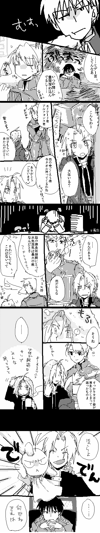ちなみにこの後、てるてる坊主だと馬鹿馬鹿しい→なんだよ人様の厚意はありがたく受け取っておけよウソ大佐→迂闊に受け取って変な恩を着せられてはたまらんからな→ほうほう、でもまぁ折角作ったんだし有効活用しとかねぇとな?(てるてる坊主を逆さまに)(ファルマンがすかさず逆さ坊主のうんちく以下略)→……縁起でもないことをするんじゃない→おやおやぁ?大佐殿はてるてる坊主なんて信じてr→わかったから逆さにするんじゃない!!!